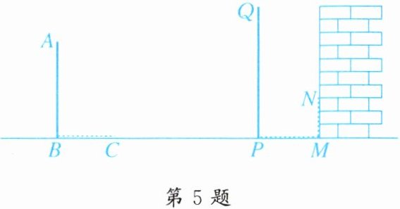 5. 在同一时刻两根竹竿在太阳光下的影子如图所示,其中竹竿$AB = 2m$,它的影子$BC = 1.6m$,竹竿$PQ$的影子有一部分落在了墙上,$PM = 1.2m$,$MN = 0.8m$.求竹竿$PQ$的长度.