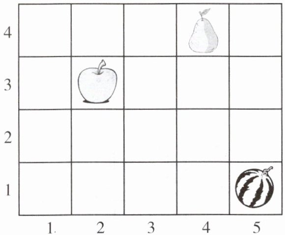 2. 下图中若苹果的位置用数对表示是$(2,3)$,则梨的位置用数对可以表示为(,),西瓜的位置用数对可以表示为(,)。