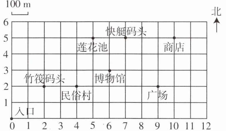(1)200 400 (2)(10,5) 100 北 300 (3)略 (4)他先后去了竹筏码头、民俗村、博物馆、快艇码头和商店,还有莲花池、广场和咖啡馆没有去。