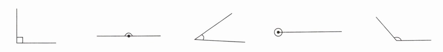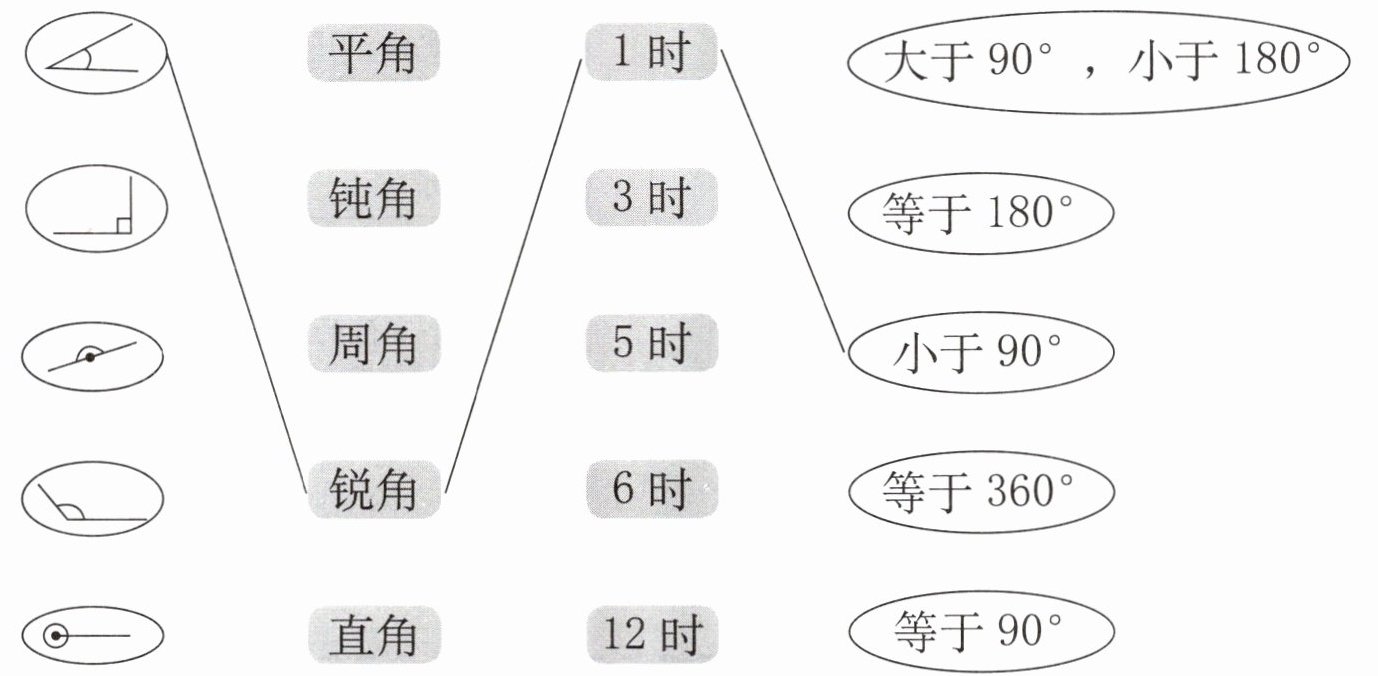 平角——等于180°;钝角——大于90°,小于180°;周角——等于360°;锐角——小于90°;直角——等于90°;1时——锐角;3时——直角;5时——钝角;6时——平角;12时——周角。