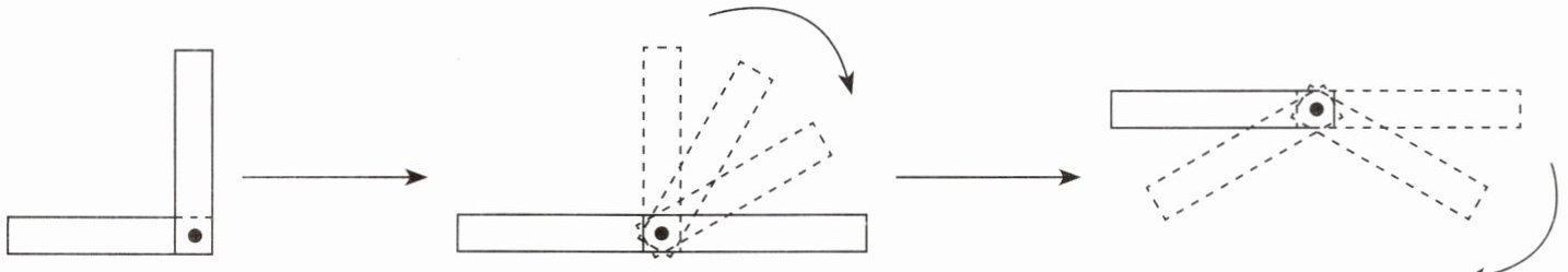 2. 把两张硬纸条钉在一起,组成了一个角。旋转其中一条边,直到两条边成一条直线,这时形成的角是平角;继续旋转这条边,直到两条边重合,这时形成的角是周角,它的度数等于4个直角的度数之和。
