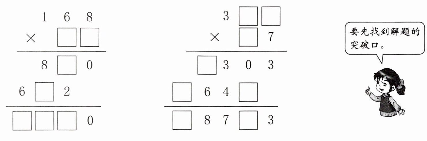 $\begin{array}{r}1\ \ 6\ \ 8 \\×\ \ □\ \ □ \\\hline8\ \ □\ \ 0 \\6\ \ □\ \ 2 \\\hline□\ \ □\ \ □\ \ 0 \\\end{array}\\ $