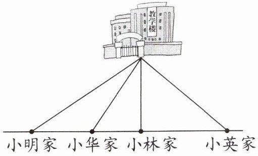 1. 有四位同学的家在同一条街道上,如下图,( )家离学校最近,这是因为( )。