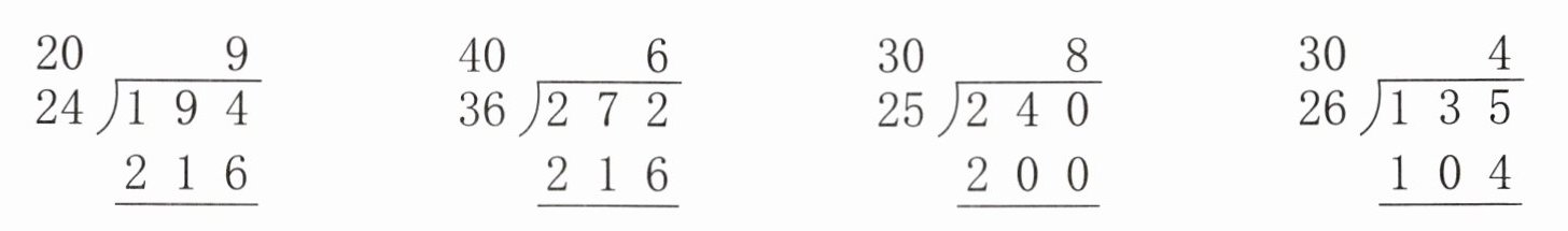\begin{array}{r}24\enclose{longdiv}{194} \\\underline{216} \\商(\quad)\end{array} \quad\begin{array}{r}36\enclose{longdiv}{272} \\\underline{216} \\商(\quad)\end{array} \quad\begin{array}{r}25\enclose{longdiv}{240} \\\underline{200} \\商(\quad)\end{array} \quad\begin{array}{r}26\enclose{longdiv}{135} \\\underline{104} \\商(\quad)\end{array} $