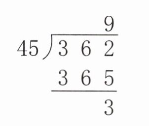 $\begin{array}{r}45\enclose{longdiv}{362} \\\underline{365} \\3\end{array} \quad