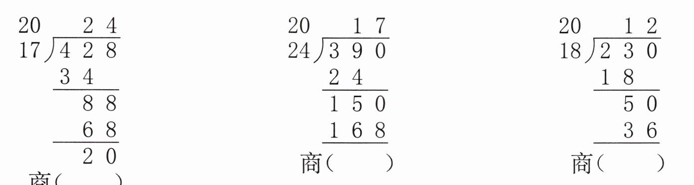 $\begin{array}{r}24\\17\enclose{longdiv}{428}\\34\quad\\\hline88\\68\\\hline20\end{array} $商( )