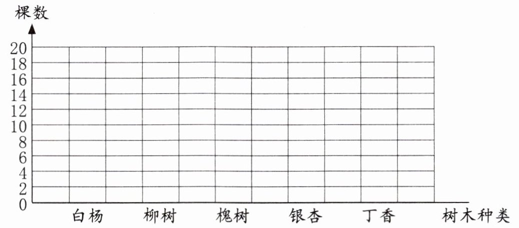 (2) 在条形统计图中,白杨对应 18 的位置涂满格,柳树对应 12 的位置涂满格,槐树对应 6 的位置涂满格,银杏对应 10 的位置涂满格,丁香对应 14 的位置涂满格。