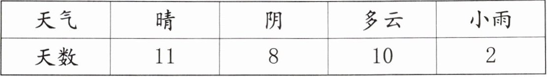 晴:涂11格;阴:涂8格;多云:涂10格;小雨:涂2格。(注:此处需在答题卡对应图中完成涂色,文字描述仅为示意)
