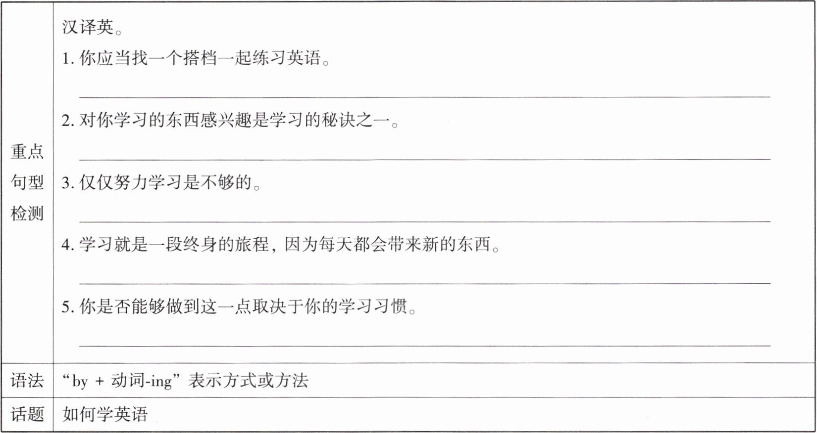 1. You should find a partner to practice English with. 2. It's one of the secrets to taking an interest in what you learn. 3. It's not enough to just study hard. 4. Learning is a lifelong journey because every day brings something new. 5. Whether or not you can do this depends on your learning habits.