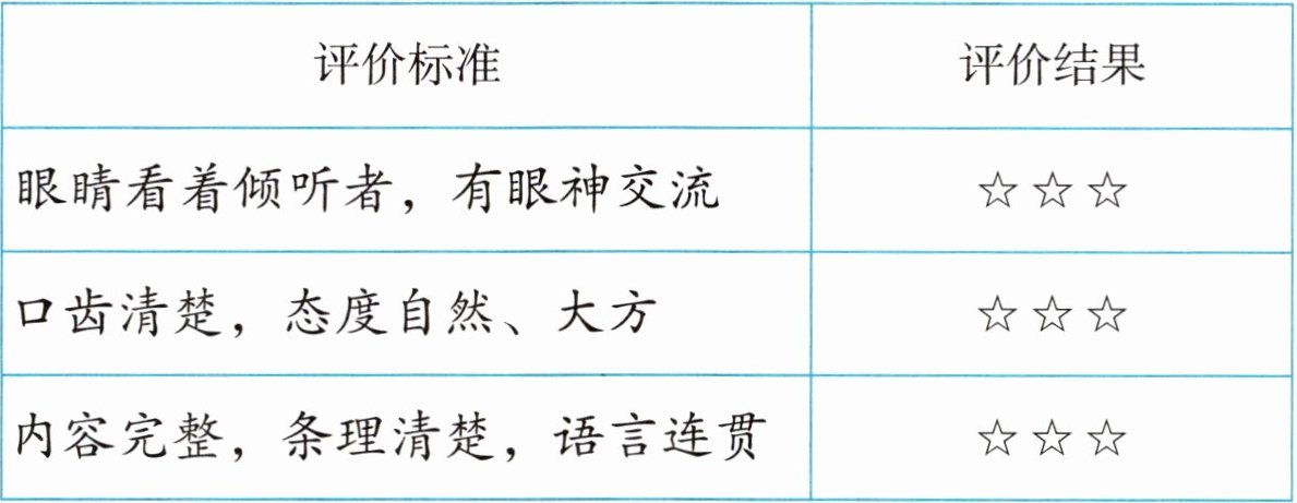 3. 本题是口语表达题,考查学生的语言表达能力和对课文内容的掌握程度。需要按照评价标准进行讲述,并争取好的评价结果。