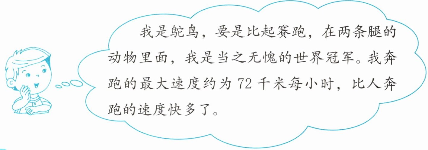 我是鸵鸟,要是比起赛跑,在两条腿的动物里面,我是当之无愧的世界冠军。我奔跑的最大速度约为72千米每小时,比人奔跑的速度快多了。