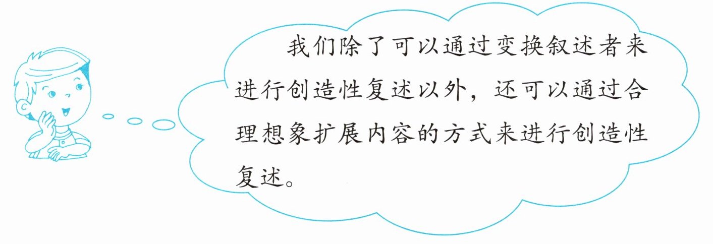 我们除了可以通过变换叙述者来进行创造性复述以外,还可以通过合理想象扩展内容的方式来进行创造性复述。