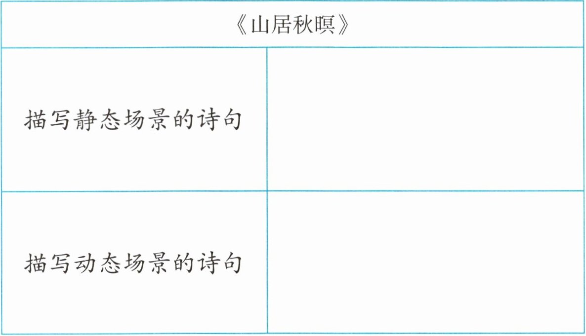 【解析】:本题考查对古诗词《山居秋暝》中静态场景和动态场景描写的识别与填写。需要回顾诗句内容,找出描写静态和动态的诗句分别填入对应表格。