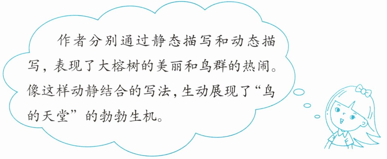 作者分别通过静态描写和动态描写,表现了大榕树的美丽和鸟群的热闹。像这样动静结合的写法,生动展现了“鸟的天堂”的勃勃生机。