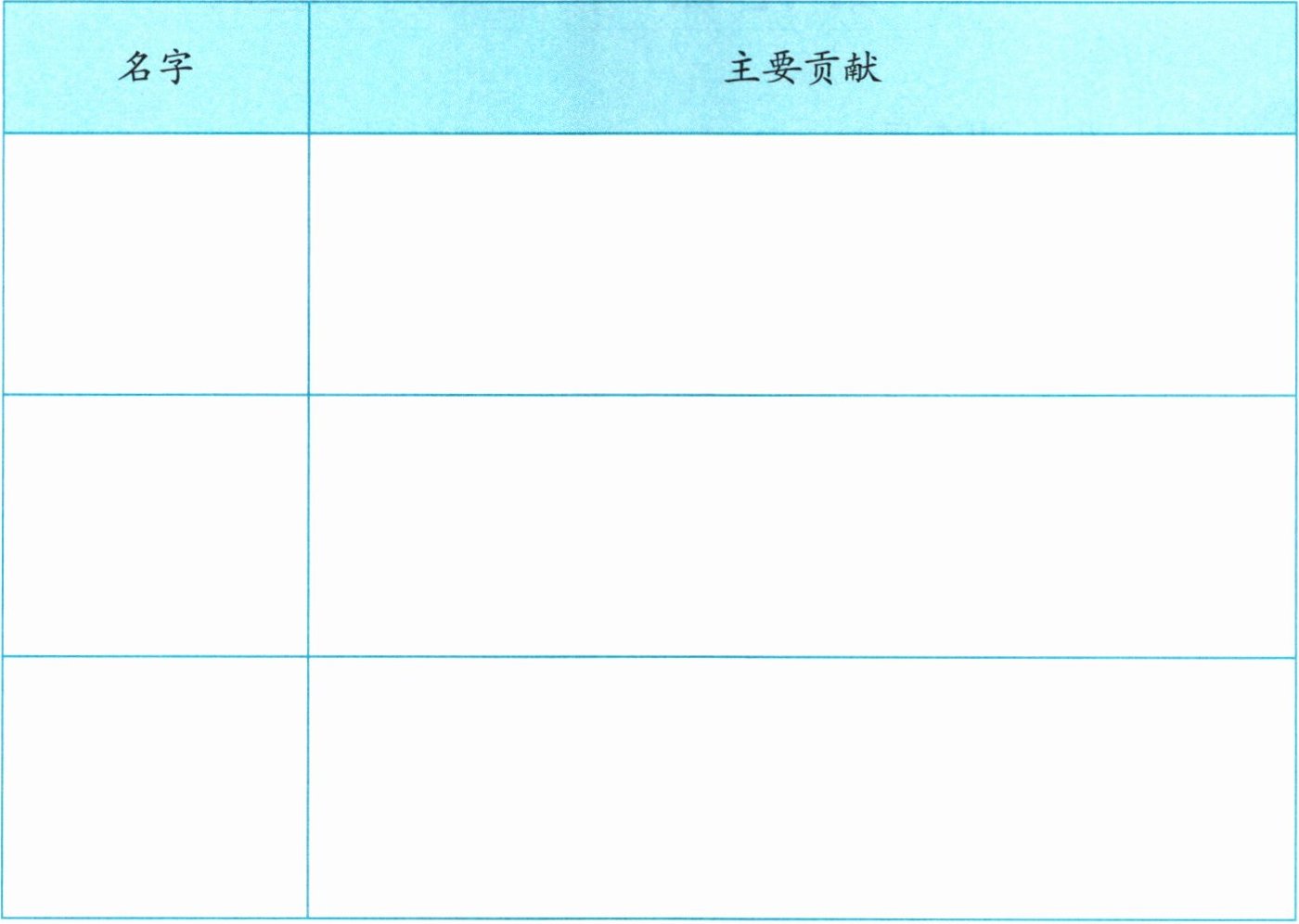 2. 填写三位你最崇敬的为建设新中国立下功劳的劳动模范或科学家的名字,并写出他们的主要贡献。