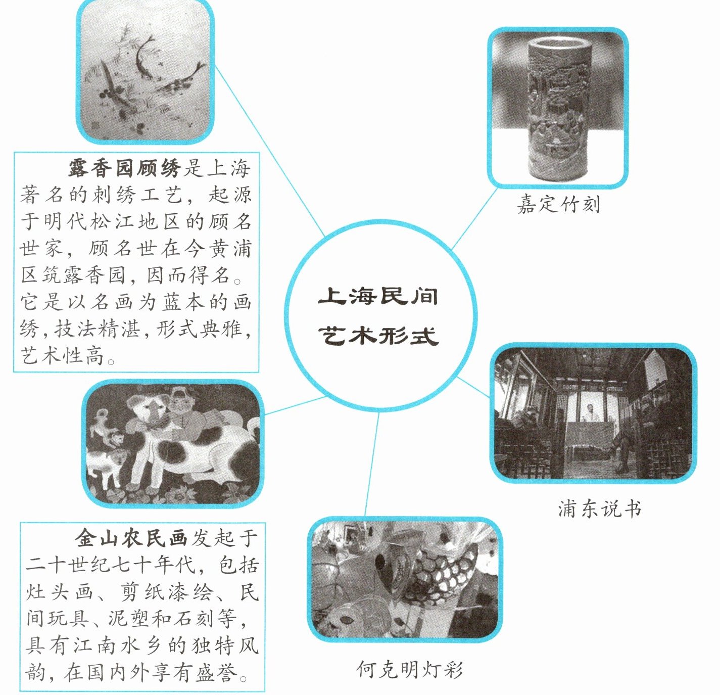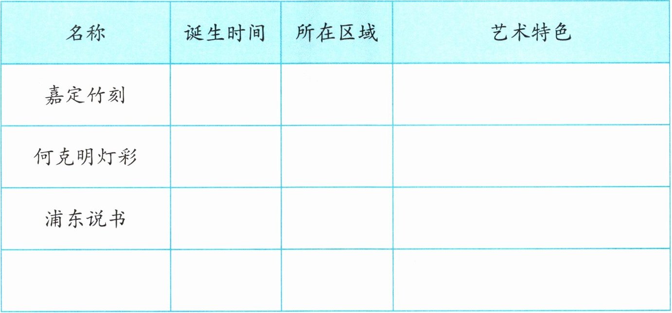 上海有着丰富多彩的民间艺术形式,如露香园顾绣、金山农民画等。你还知道其他的上海民间艺术吗?请你选择2~3个自己感兴趣的上海民间艺术,查阅相关资料,记录在下一页的表格里。
