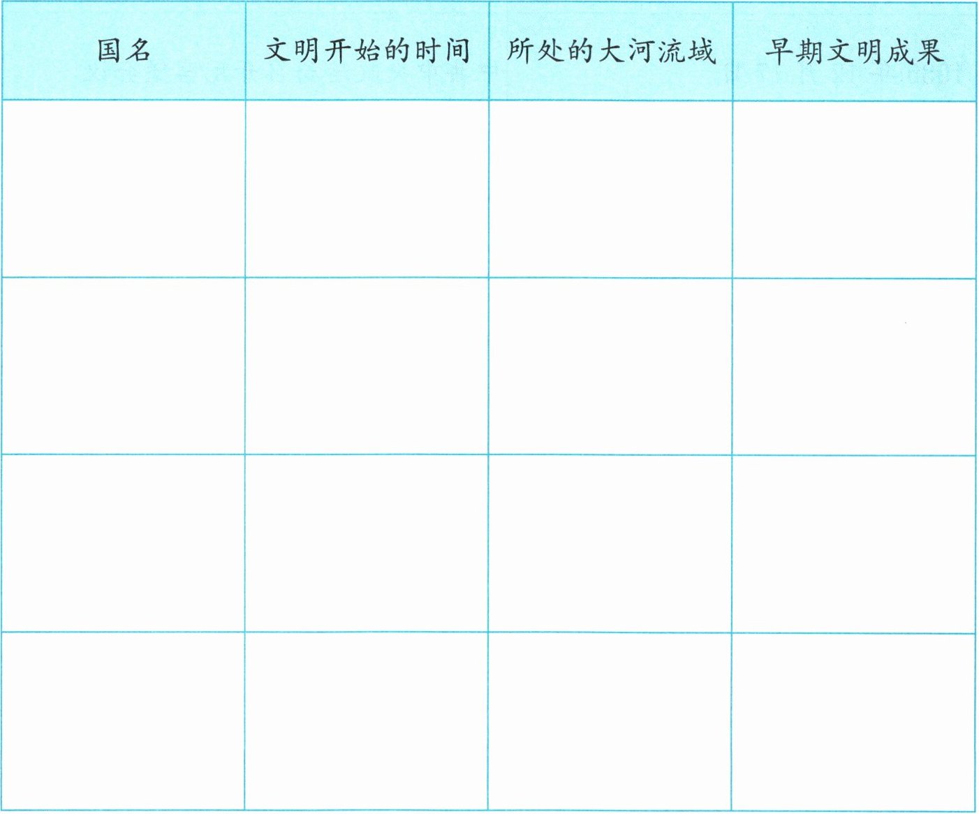 本题主要考查四大文明古国的相关知识,包括文明开始的时间、所处的大河流域以及早期文明成果。这需要我们对古代文明的基本常识有所了解,并能准确填写到表格中。
