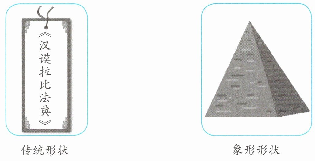 【解析】:本题主要考查对古代文明相关知识的了解以及创意实践能力。题目要求制作一个与古代文明有关的创意书签,从形状和内容两方面提出要求。形状可以是传统形状或象形形状,如示例中的传统书签形状和金字塔形、甲骨形状等;内容要选择与古代文明有关且精炼的文字。这需要学生对古代文明的知识有一定积累,比如古代著名法典、古老文明建筑、古代文化符号等,然后发挥创意将古代文明元素融入到书签制作中。