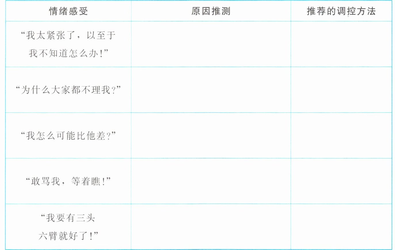8. 以下是我们生活中常见的情绪感受。请在“原因推测”一栏中写出可能产生该情绪感受的原因,在“推荐的调控方法”一栏中写出你认为比较有效的调控情绪的方法。