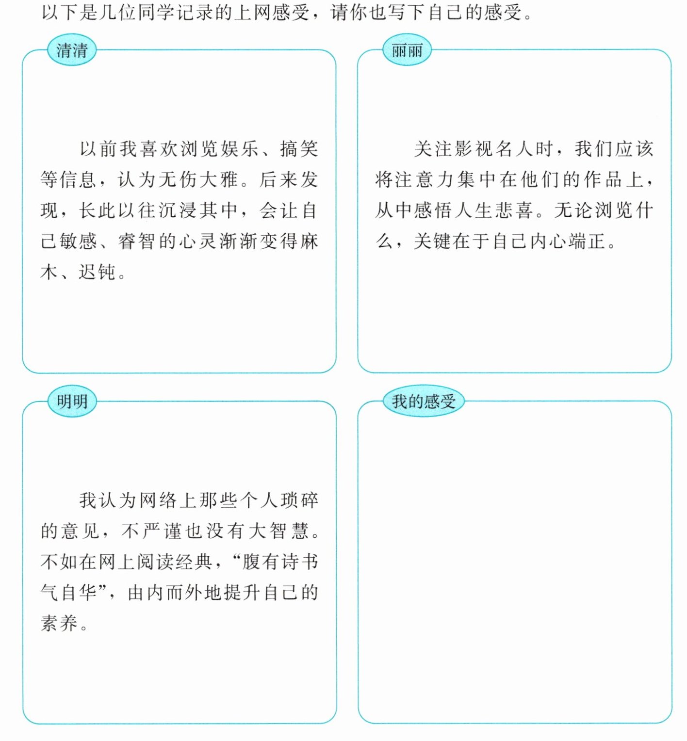 以下是几位同学记录的上网感受,请你也写下自己的感受。