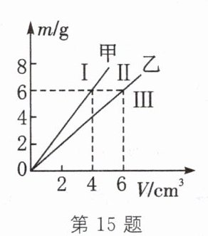 15. 如图所示是小明探究质量与体积关系时绘制的甲、乙两种液体质量与体积的关系图像,由图像可知,$2\ cm^3$ 的甲液体质量为