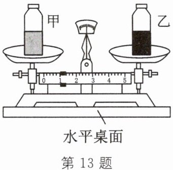 13. 两个相同的瓶子中分别装入体积相等的甲、乙两种不同的液体,将两个瓶子放在已调节平衡的天平上,调节游码后如图所示,天平仍然平衡,则瓶中液体的质量 $m_{甲}$