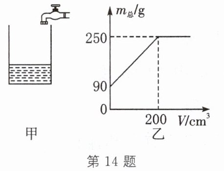 14. 如图甲所示,一杯中已经装有 $50\ cm^3$ 的某种液体,打开龙头,向杯中继续加入该种液体,杯子和杯中液体的总质量 $m_{总}$ 与从龙头中流出的液体体积 $V$ 的关系如图乙所示,杯子的容积为