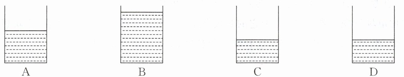 3. 如图所示,有四只相同的烧杯,各盛有质量相等的煤油、汽油、植物油和硫酸($ \rho_{硫酸} > \rho_{植物油} > \rho_{煤油} > \rho_{汽油} $),其中盛汽油的烧杯是(