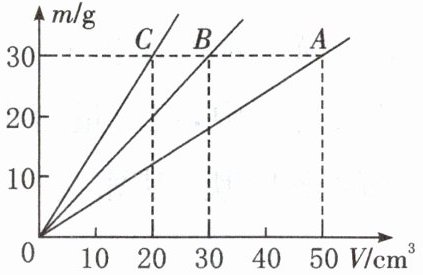 5. 如图所示是 $ A $、$ B $、$ C $ 三种物质的质量 $ m $ 与体积 $ V $ 的关系图,由图可知,$ A $、$ B $、$ C $ 三种物质的密度的大小关系是(