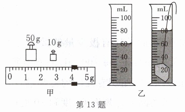 13. 在做“用天平和量筒测定固体的密度”的实验时,某同学测量石块的质量如图甲所示,测量石块的体积如图乙所示,请你代他完成数据记录并计算出密度。石块的质量为