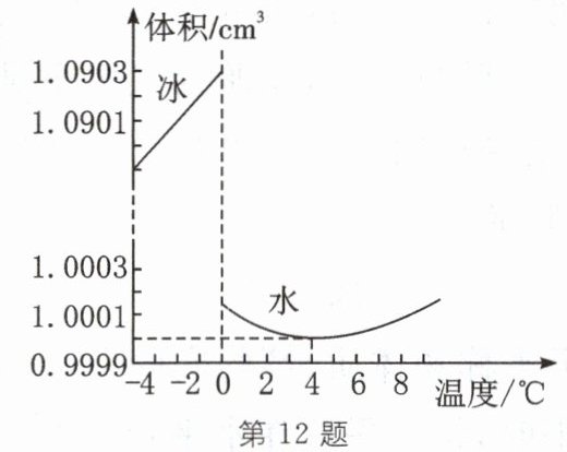 12. 为探究冰和水的体积与温度的关系,将一定质量的冰放入人密闭容器中进行加热,记录其体积和温度,得到了如图所示的图像。下列分析正确的是(