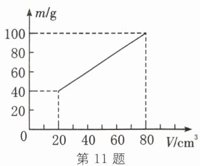 11. 在测量液体密度的实验中,小明利用天平和量杯测量出液体和量杯的总质量m及液体的体积V,得到几组数据并绘出如图所示的m-V图像,下列说法正确的是(