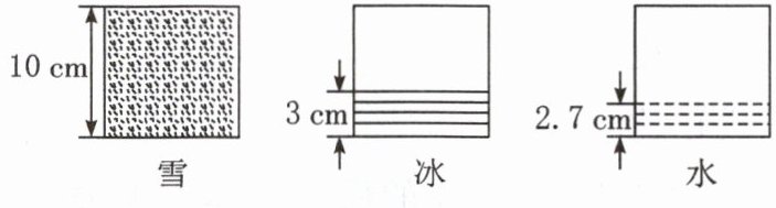 13. 要测量雪的密度,如图所示,某同学找来一个容积为1000cm^3的立方体容器,先装满蓬松的雪,然后将雪平整地压紧为3cm厚的冰,冰完全熔化成水的深度为2.7cm,$\rho_{水}= 1g/cm^3$。下列说法正确的是(