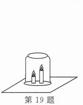 19. 点燃两支长度不同的蜡烛,将其固定在桌面上,如图所示。如果用玻璃烧杯将两支蜡烛烛罩在里面,发现较长的一支蜡烛先熄灭,这是由于燃烧产生的温度较高的二氧化碳气体的密度比空气的密度