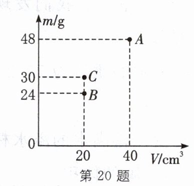 20. 在“测量物质的密度$\rho$”实验时,用相同的容器分别装两种不同液体,先后测量容器和液体的总质量m,液体体积V,共测得三组数据,并在m-V坐标系上画了出来,如图所示,可以判定______(选填“AB”“AC”或“BC”)是同种液体。则A点对应的液体的密度是______g/cm^3,另一种液体的密度为______kg/m^3。