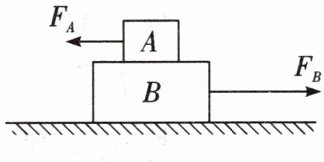 10. 如图所示,物体A、B叠放在水平桌面上,方向相反的水平拉力$ F_A $、$ F_B $分别作用于物体A、B上,使A、B一起在桌面上做匀速直线运动,已知A、B始终保持相对静止,且$ F_B = 2F_A $。以$ f_A $表示A受到的摩擦力大小,以$ f_B $表示B受到桌面的摩擦力的大小,则(