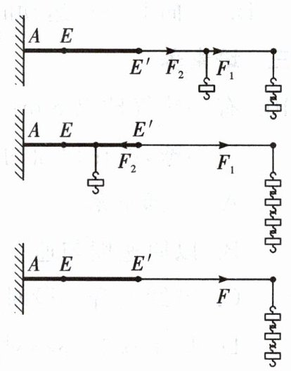 任务 如图是小明在探究同一直线上两个力的合成的实验图。图中粗线为橡皮筋,其原长为 $ AE $,受力后伸长为 $ AE' $,钩码每个重 $ 0.5 \, N $。根据以上实验结果,分析讨论同一直线上二力合成的情况。