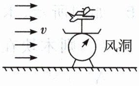 11. 如图所示,在某科技馆内陈列着一个模拟“风洞实验室”,一架重 $ 15 \, N $ 的模型飞机固定在台秤的秤盘上。当迎面吹向模型飞机的风速 $ v $ 达到 $ 20 \, m/s $ 时,台秤的读数为 $ 8 \, N $,则模型飞机获得的升力为