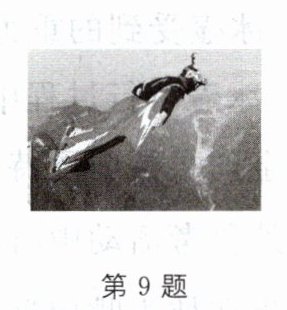 9. 如图是一名质量为 $60$ kg 的飞行爱好者穿戴着飞行背包在空中飞行时的情景,飞行背包的两个喷射口向下喷射出气流能将人推向空中,这是因为