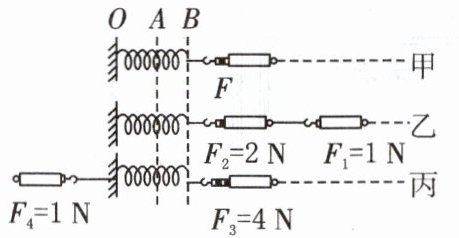 (1)在图甲、乙、丙中,该同学在实验中使弹簧都从A点拉伸到同一B点,是为了使三次实验中力的作用效果