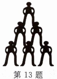 13. 叠罗汉是一种二人以上层层叠成各种造型的游戏,也是一种高难度的杂技。如图所示为六人叠成的三层静态造型,假设每个人所受重力均为G,下面五人的背部均呈水平状态,则最底层最右边的人的一只脚对水平地面的压力约为