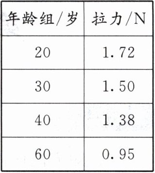 (1)测得该案犯的头发所能承受的拉力是1.58N,根据人的头发所能承受的拉力随年龄而变化的规律(变化规律见右表),则大致可确定该案犯的年龄属于
