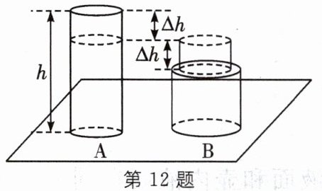 12. 如图所示,两个密度均匀质量相等的圆柱体A、B,底面积之比为$S_A:S_B = 2:3$。若将A的上方水平截去一段叠放在B的正上方后,A剩余部分对水平面的压强恰好等于此时B对水平地面的压强,A剩余部分的高度与叠放后B的总高度相同,则A截去的高度与A原高度之比为$\Delta h:h= $