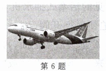 6. 如图是我国C919大型客机首飞的情景,飞机在规定空域内巡航飞行的高度为4500m,与起飞前相比,此高度处大气压