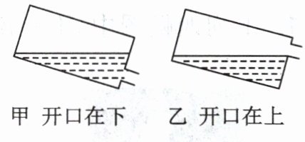 7. 将新打开盖子的饮料盒中的果汁倒入杯中时,选择图甲方式(开口在下)倒饮料,会出现果汁不易流出,断断续续的现象,果汁也很容易溅到杯子外面;选择图乙方式(开口在上)倒饮料,果汁容易稳定地倒出,不易溅到杯子外面。请分析说明甲、乙两种方式倒果汁效果不同的原因。