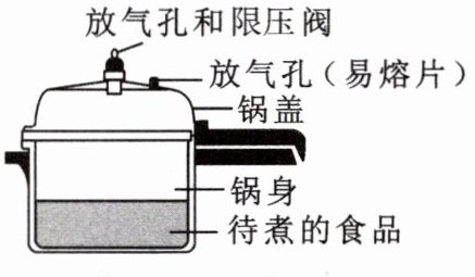10. 如图所示是家庭厨房中常见的炊具——高压锅,它的自重为40N,放在水平桌面上,与桌面的接触面积是$0.04m^2,$为了保障安全性,高压锅的出气孔上放置了限压阀,当限压阀受到的锅内压力等于锅外压力和它所受重力时,恰好能顶开限压阀进行放气,锅盖内表面接触蒸汽的面积是$450cm^2,$限压阀出气孔的横截面积为$0.05cm^2,$锅外为1个标准大气压$,ρ_{水}= 1.0×10^3kg/m^3,g$取$10N,p_{大气压}= 1.0×10^5Pa。$求: