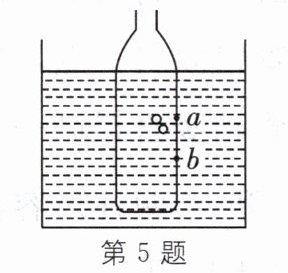 5. 如图所示为一个饮料瓶,将其侧壁所扎的a、b两个小孔封住,瓶内盛有一定量的饮料(密度大于水),把它放入水中,当瓶内外液面相平时,将a、b封口打开,则(