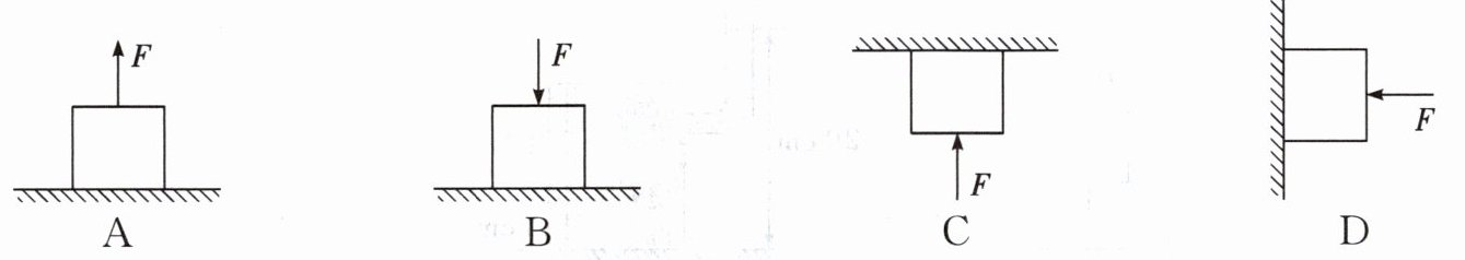 1. 如图所示,若物体受到的重力均为10N,受到的外力F均为15N,则物体对地面或墙面压力最小的是(