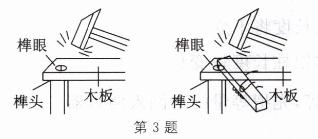 3. 如图所示,木工在手工制作家具时,将榫头套入木板上的榫眼时,常在榫头上方的榫眼处垫一木条,再进行敲击,这么做的目的是(