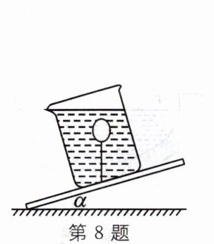 9. 一烧杯放在斜面上,画出图中质量为$0.5kg$的小球受浮力的示意图。(忽略空气阻力,$g取10N/kg$)